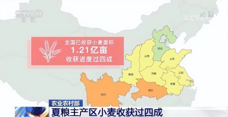 其中四川、湖北麦收基本结束,安徽麦收进度过七成半,河南近六成,江苏过两成半,陕西近一成半,山东、山西已开镰收获。