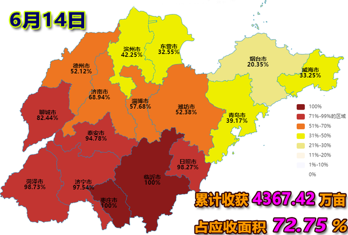 据农业农村部农情调度,截至6月13日17时,全国已收获小麦面积2.56亿亩,收获进度84.1%,比去年慢约1.9个百分点。其中,河南、江苏麦收已结束,陕西近九成,山东过六成半,山西过半,河北过三成。