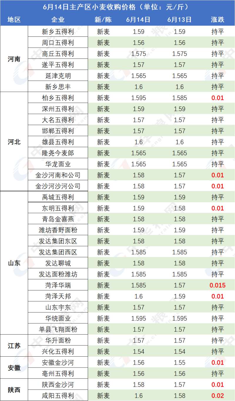 6月14曰中午14点,柏粮储备库收购小麦1.585元/斤(涨1分),增价不变。