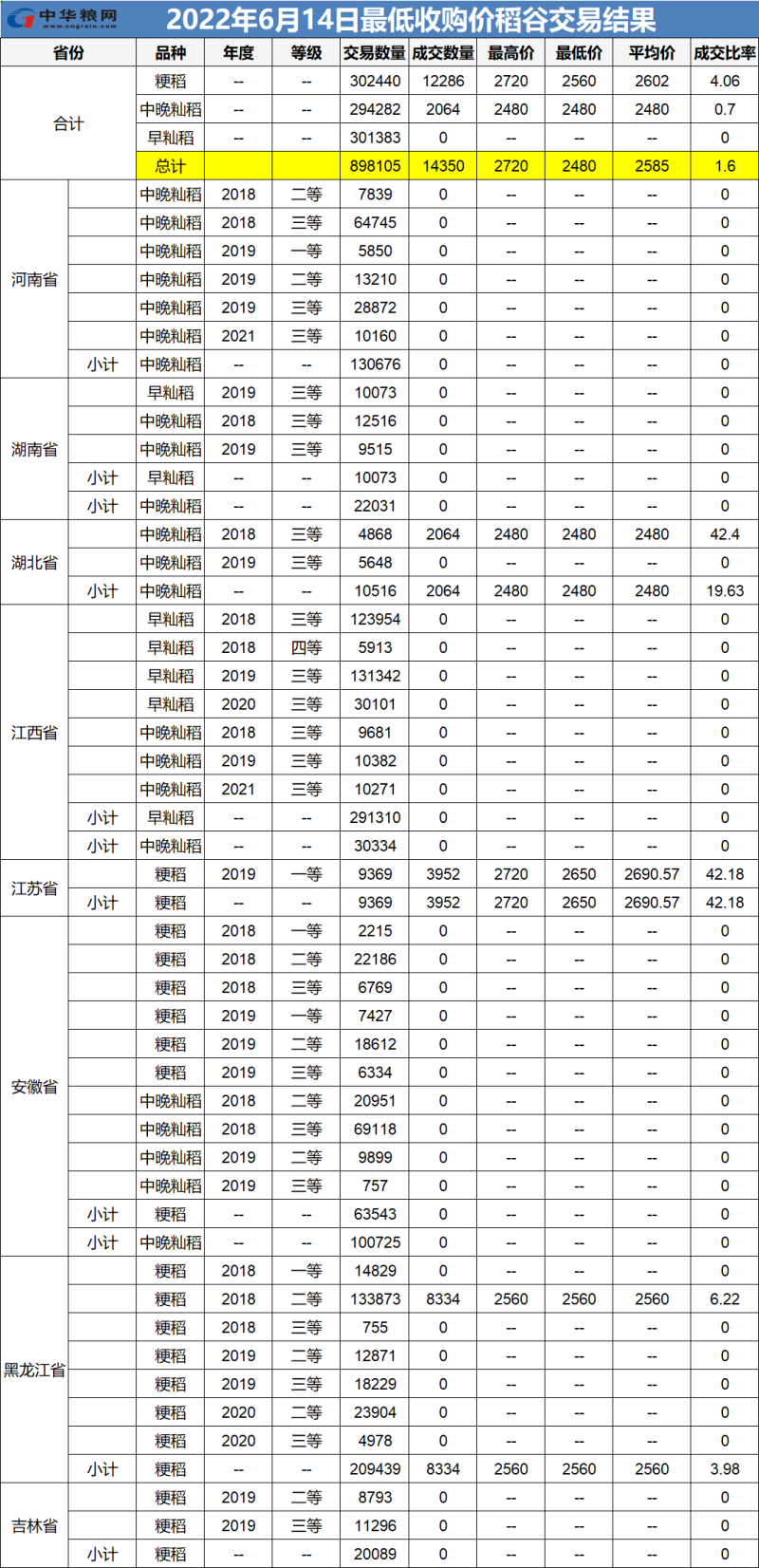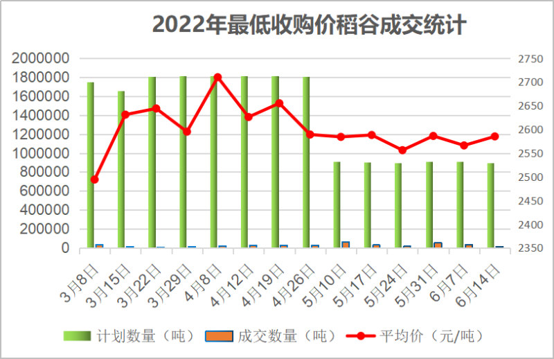据统计,截至6月14日,最低收购价稻谷销售已举办14次,累计成交量401.22万吨左右,成交均价2603元/吨较去年大幅降低。