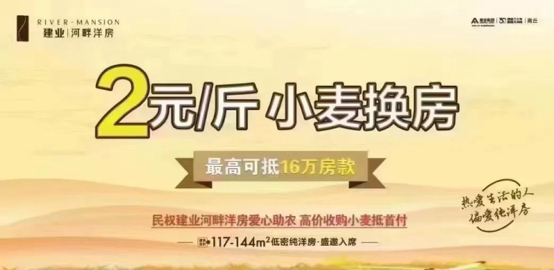 据媒体报道,河南商丘一名为“建业河畔洋房”的房地产项目推出“小麦换房”的购房活动。海报信息显示,购房人可用小麦来付首付款,价格按照2元/斤,最高可抵16万元。