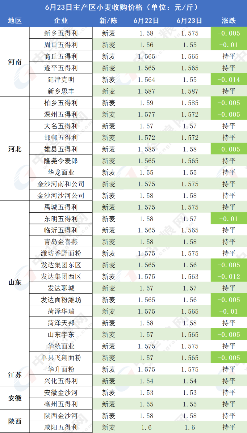 自2022年6月23日晚6点,聊城直属库有限公司收购小麦价格下调1分,收购价格执行1.565元/斤,质量标准不变。这两天累计下调1.5分。