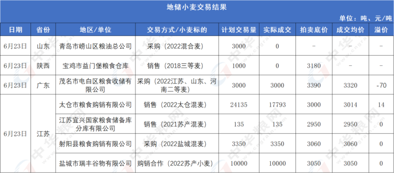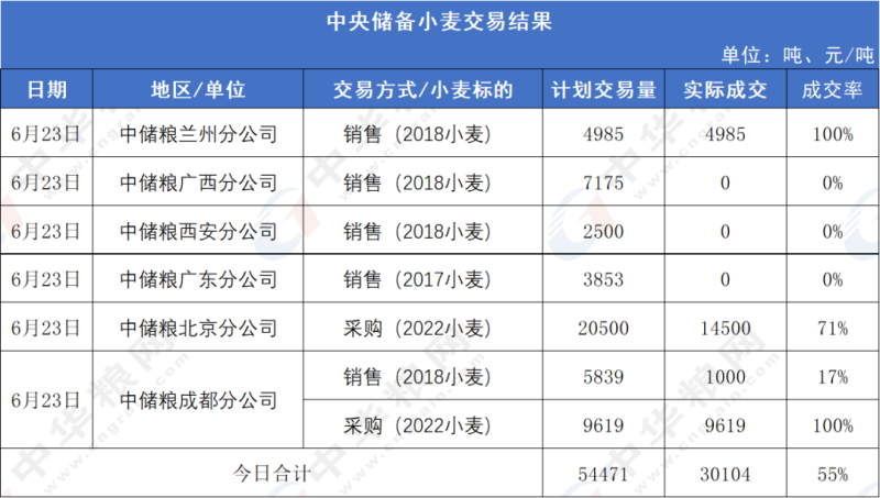 6月23日中储粮北京分公司竞价采购2022年小麦20500吨,成交14500吨,成交率71%。
