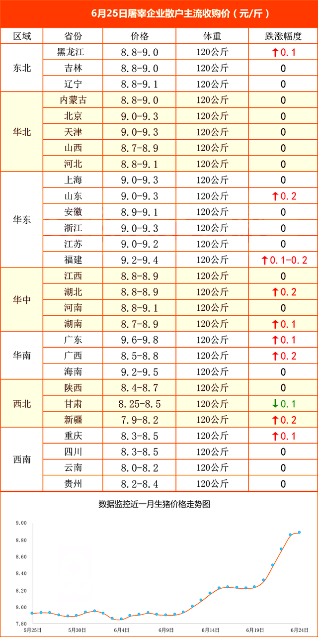 如今,油价即将止步连涨,迎来久违的落价!而在生猪市场,猪价节节上涨后,市场“变脸预警”凸显!众所周知,进入6月初,国内生猪均价横盘15.7~15.8元/公斤,6月中旬以来,猪价出现了2轮上涨的浪潮,一波未平一波又起,而此轮猪价上涨,进一步推高了国内标猪价格,据数据了解,6月25日,全国生猪出栏均价涨至17.77元/公斤,本轮猪价累计上涨1.33元,涨幅8.1%,本月猪价涨幅累计达到了13.2%,猪价大涨也超过了业内人士的预期!