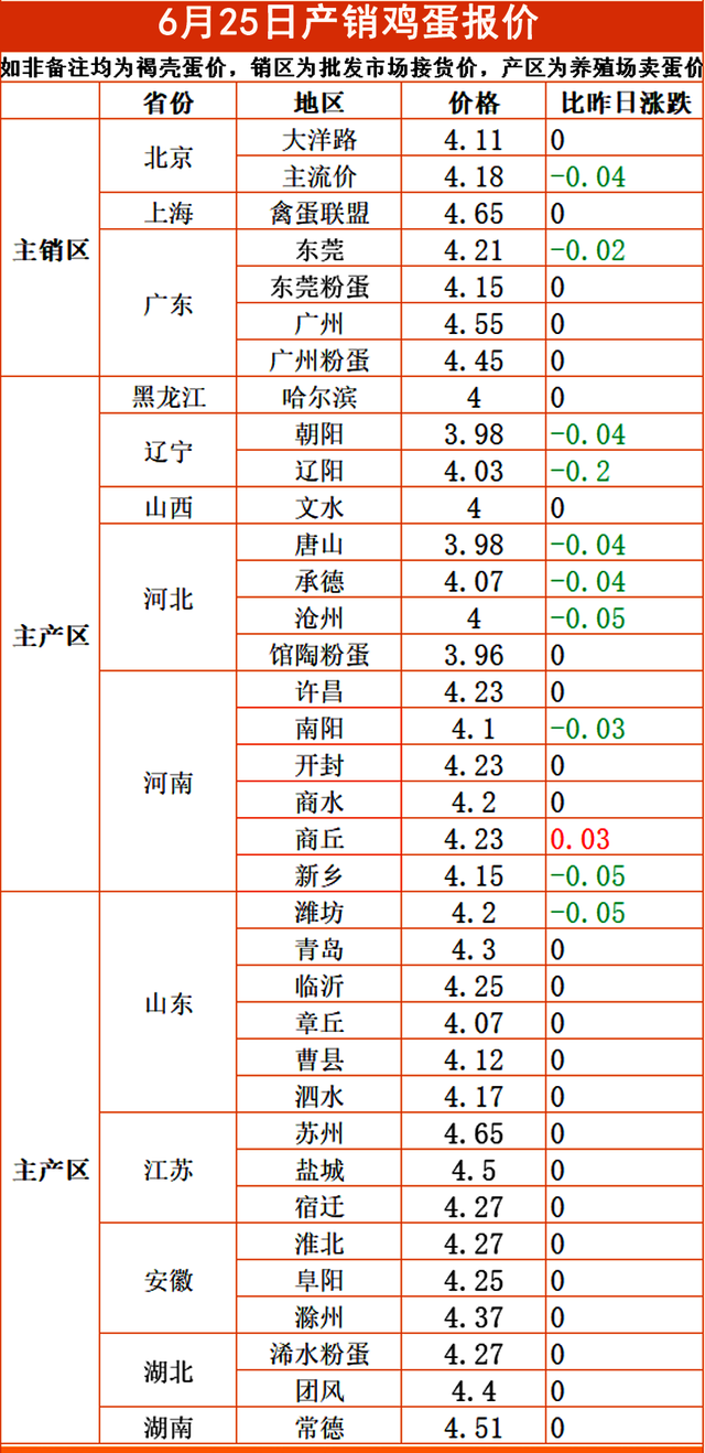其中,在北京市场,蛋价横盘4.1~4.2元/斤;在上海以及广东市场,蛋价普遍企稳,上海市场横盘4.65元/斤。在广东地区,东莞褐壳鸡蛋维持在4.2元/斤左右。而在产区市场,河北辽宁等地,产区蛋价震荡下跌,河北市场部分褐壳鸡蛋跌破4元/斤,在山东以及河南地区,价格也以企稳为主,山东市场横盘4.1~4.3元/斤!