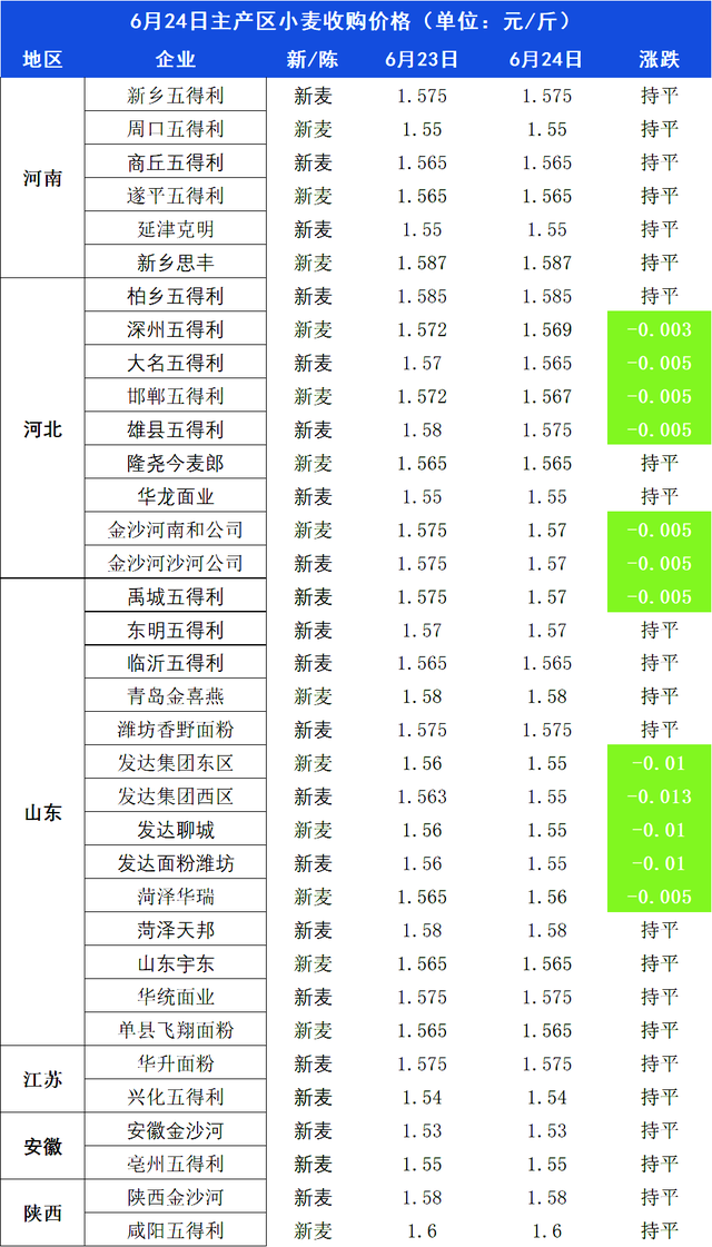 目前,由于新麦收割告一段落,基层余粮较为宽松,企业到货也明显增加,但是,由于面粉厂终端产品走货不顺,炎热的夏季,居民囤面的情绪不高,工厂开工率徘徊在低位,而入库粮源增加,企业有了一定库存,高价收粮的积极性回落,部分企业逐步压价收粮,五得利、金沙河落价不断,小麦价格重心也跌至1.55~1.58元/斤左右!