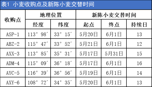 小麦收购点的基本信息:我国黄淮麦区的小麦收割时间遵循从南向北逐步开镰的特点。收割过了黄河之后,继续向北、向西北和东北方向展开。本文所选小麦收购点覆盖了东经108°72´-116°39´,北纬33°15´-36°56´的区域,涵盖了黄淮麦区的重要产区,包括河南省(2个点)、安徽省(1个点)、河北省(1个点)、山东省(1个点)和陕西省(1个点)。