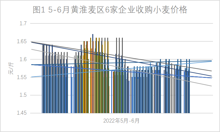 数据来源:选择位于黄淮冬麦区核心区域、生产规模名列全国前茅的6家制粉企业,以企业公示的2022年5-6月到厂小麦收购价为基本数据,参照2021年5-6月收集的部分数据,用Excel Office 2019整理数据,统计分析,制作图表。
