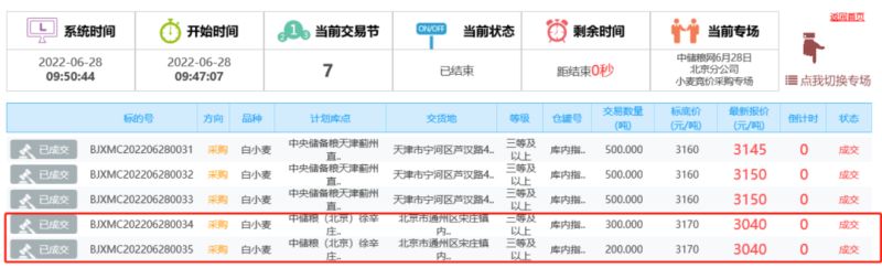 6月28日中储粮北京分公司计划采购2022年小麦25500吨,全部成交,成交价格3025-3160。