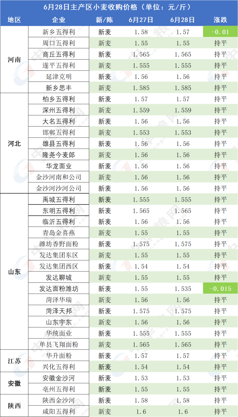 6月28日,小麦行情有止跌趋稳迹象,价格调整减少。近几天小麦价格虽然总体维持弱势回落的走势,但就产区来看,从农户、轮换企业及制粉企业来说,主流价格仍在1.50-1.60元之间波动,农户1.50及以上的售粮价格仍然很坚实,很显然,如果轮换企业及制粉企业继续下压价格已经非常不现实。