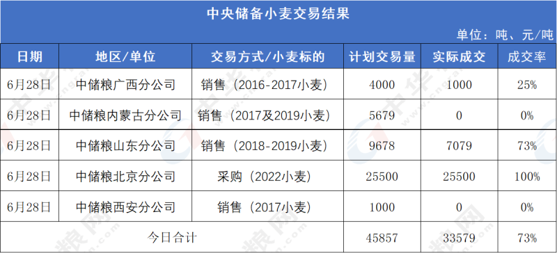 6月28日中储粮山东分公司竞价销售2018、2019年小麦9678吨,成交7079吨,成交率73%,成交价格3200元/吨。