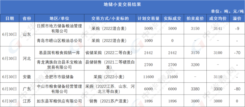 6月30日合肥市市级储备小麦竞价采购2022年产小麦11600吨,全部成交,最高价3120元/吨,最低价3090元/吨,平均价3110元/吨。
