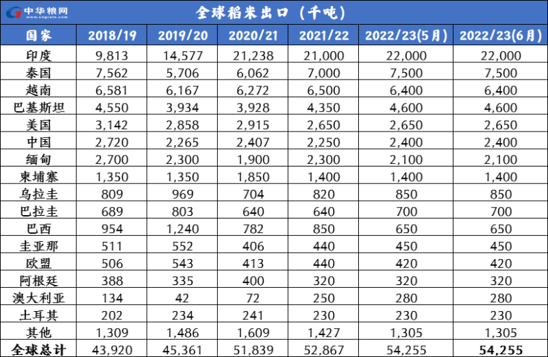 泰国作为第二大出口国,破碎率5%的大米价格下跌至每吨412-415美元,上周报420-425美元。泰国商务部数据显示,5月大米出口量同比增加24.7%,预计今年大米出口量料为750-800万吨。