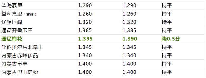 山东菏泽华瑞:降0.5分,普麦1.560元。