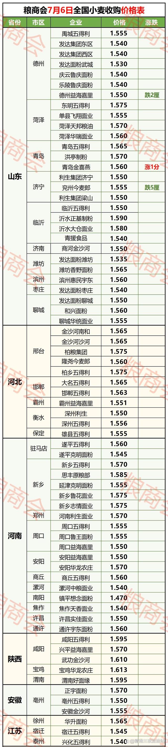 山东青岛国信集团上马库、营海库跌5厘,普麦1.565元;莱西库跌1分,普麦1.56元