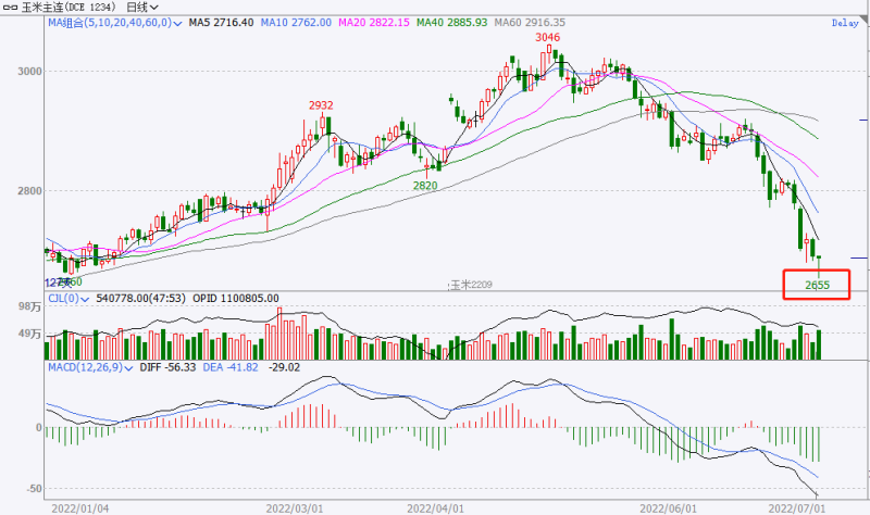 在全球经济衰退忧虑及美国中西部降雨预期的携手打压下,美盘空头氛围浓郁。国内饲料消费需求偏弱、陈稻拍卖继续投放也为市场增添压力,大连玉米下跌0.55%,盘中触及年内低点2655元,量能明昂放大至53.2万手,大幅减仓接近4.6万手。淀粉走势同样低迷,挫幅达到0.84%,刷新6个月最低水平。