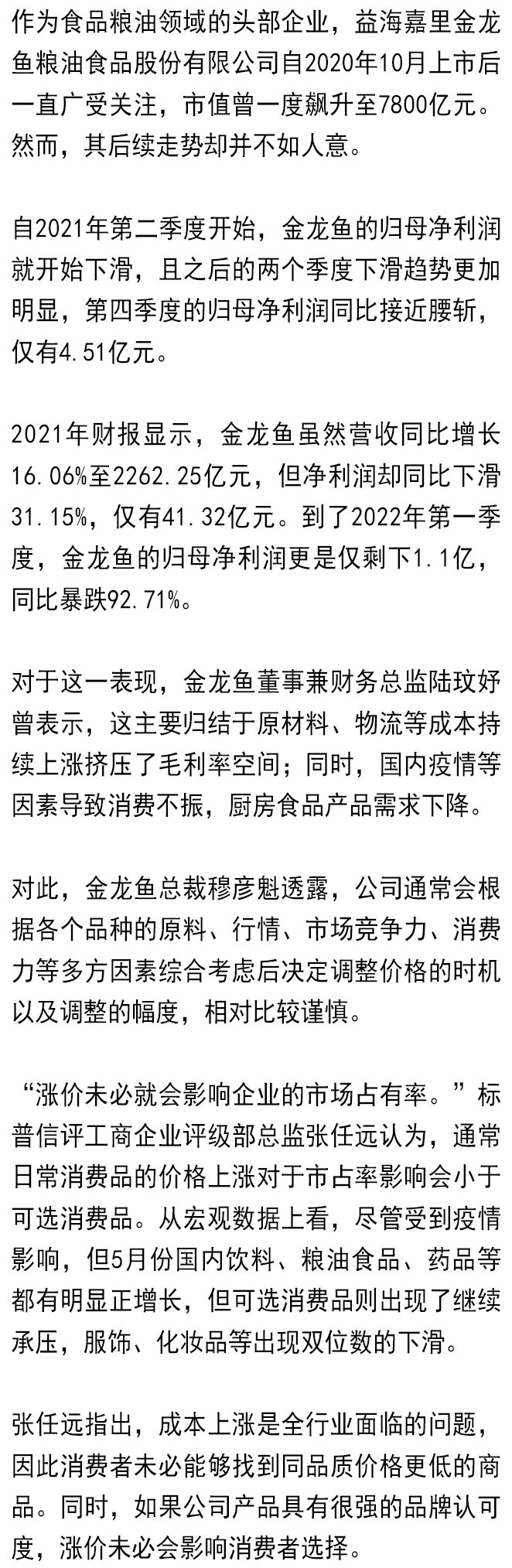 7月8日,金龙鱼股价连续第四个交易日下跌,收于52.38元/股,与2021年1月8日的收盘价145元/股相比,其股价跌幅超过60%,期间市值蒸发近5000亿元。