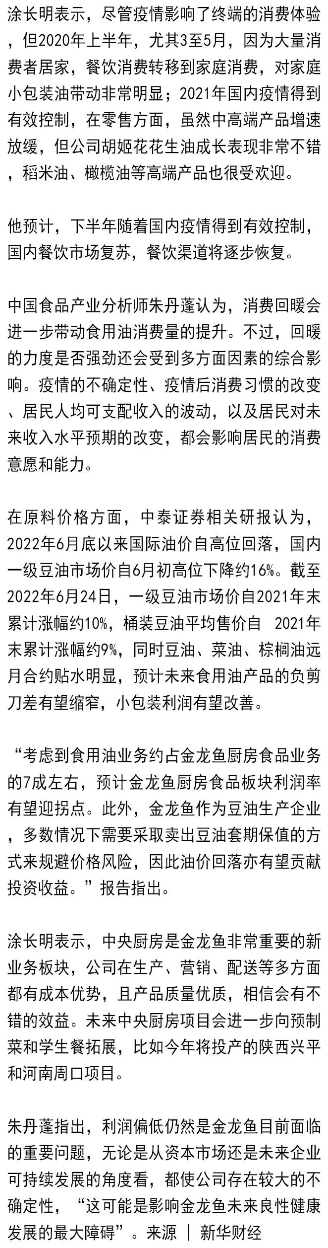 “金龙鱼在米、面产品方面的整体市场占有率还很小、成长空间很大。目前米、面行业较为分散,从行业发展历史来看,这一行业未来也会逐步向头部企业集中,公司正在持续投资米、面产能,预计相关业务增长较快。”涂长明说。
