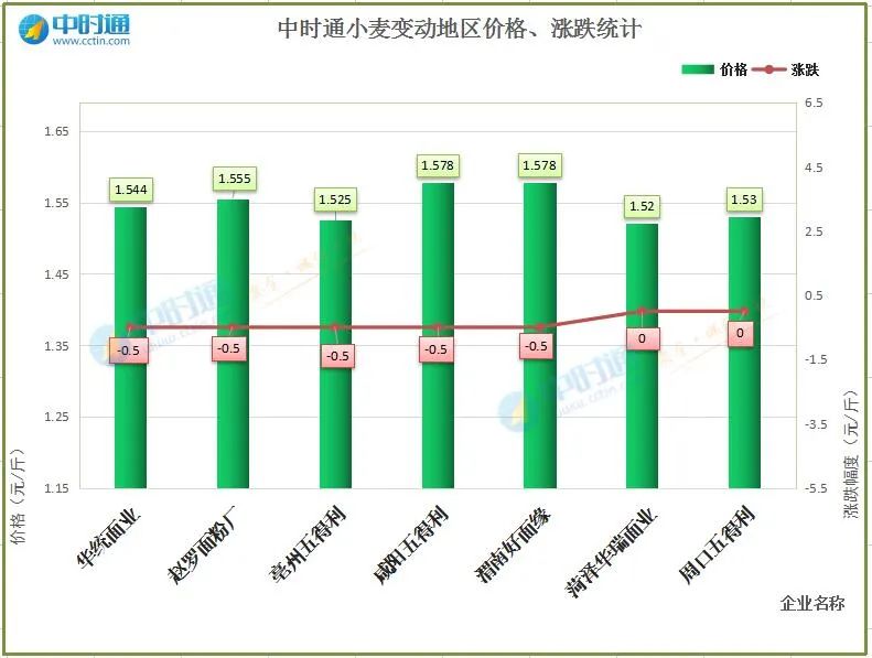 昨日下跌5厘;渭南好面缘小麦收购价格1.578元,较昨日下跌5厘。据不完全统计,今日国内面企收购均价为1.5386元/斤,继续小幅度下跌。