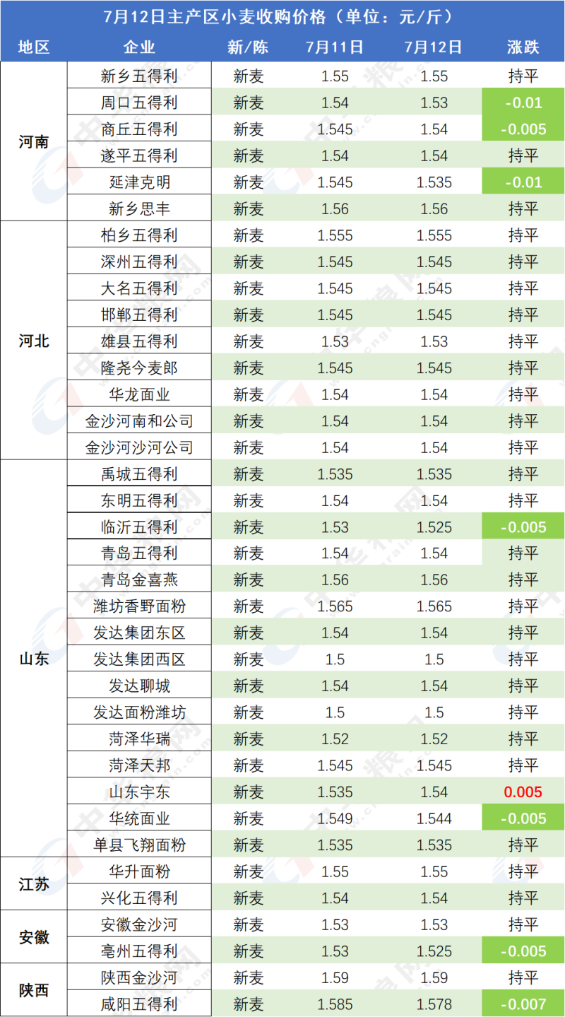 泰安公司自7月12日15:00起,进行价格调整,公司本部一等小麦1.533元/斤、二等小麦1.530元/斤、三等小麦1.523元/斤;宁阳和肥城分公司一等小麦1.530元/斤、二等小麦1.527元/斤、三等小麦1.520元/斤;东平分公司一等小麦1.515元/斤、二等小麦1.510元/斤、三等小麦1.505元/斤。