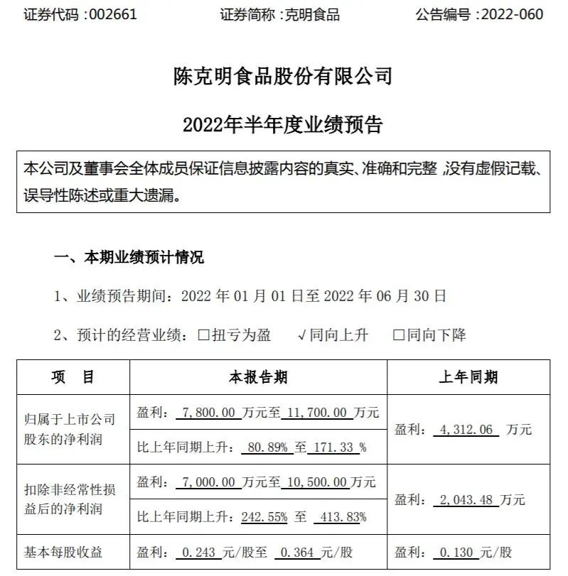 7月11日晚间,克明食品发布2022年半年度业绩预告,预计业绩同向上升。报告期内归属于上市公司股东的净利润7800.00万元-11700.00万元,比上年同期增长80.89%-171.33%;基本每股收益0.243元/股-0.364元/股。