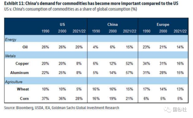 另一方面,高盛写道,“轻度衰退”对大宗商品而言不是风险,当前的宏观需求结构与2008年大不相同,当时信贷和去杠杆危机导致需求急剧下滑。而现在,美国在全球商品市场占的份额比历史上低得多,新兴市场的需求份额大幅上涨。