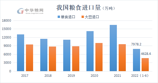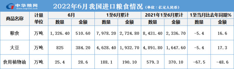 金额方面,上半年我国农产品进口7360.7亿元,同比增长了5%。其中,粮食进口2724.8亿元,增长了16.6%,占同期我国农产品进口总值的37%;大豆1932.7亿元,增长17.3%,占同期我国农产品进口总值的26%。