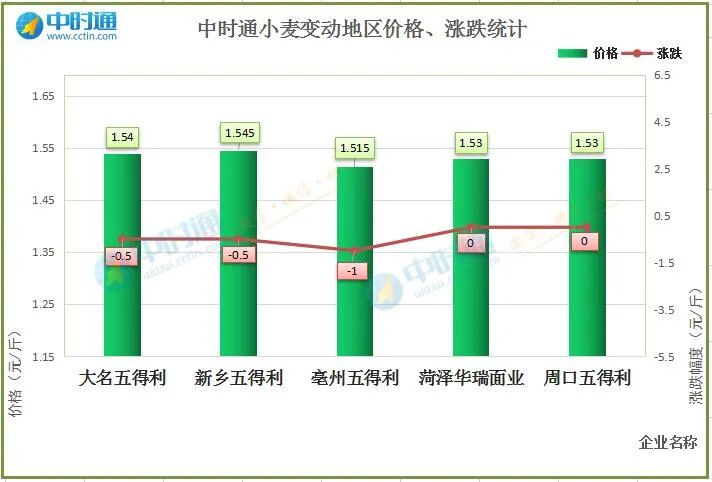 今日小麦继续保持弱势震荡,个别企业小幅度下调收购价格,大名五得利小麦收购价格1.54元,较昨日下跌5厘;新乡五得利小麦收购价格1.545元,较昨日下跌5厘;亳州五得利小麦收购价格1.515元,较昨日下跌1分。据不完全统计,今日国内面企收购均价为1.5377元/斤,继续小幅度走弱。