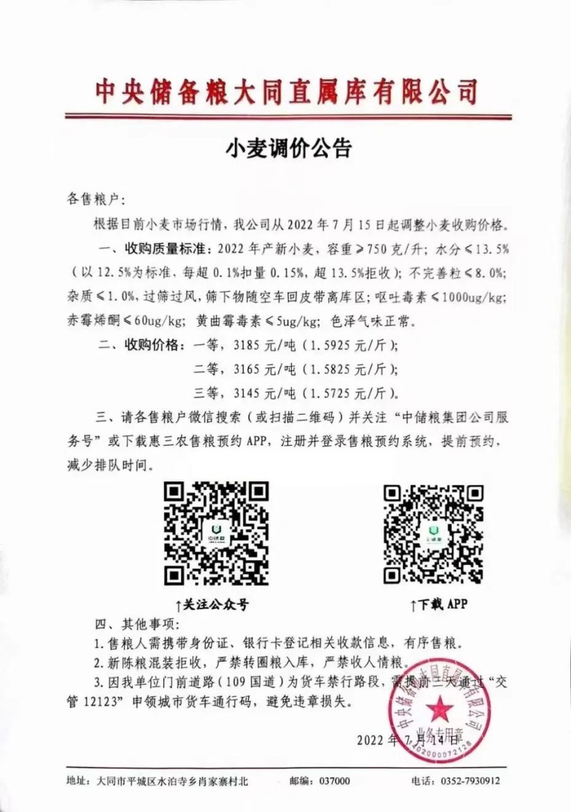 而今天中央储备粮大同直属库也发布了小麦调价公告,具体内容如图: