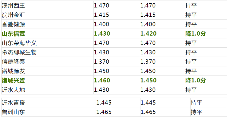 山东菏泽华瑞:涨1.0分,普麦1.530元。
