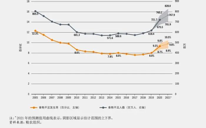 日前,联合国粮农组织、国际农业发展基金、联合国儿童基金会、世界粮食计划署和世界卫生组织联合发布的2022年《世界粮食安全和营养状况》指出,2021年全球受饥饿影响的人数已达8.28亿,较2020年增加约4600万,新冠肺炎疫情爆发以来累计增加1.5亿。