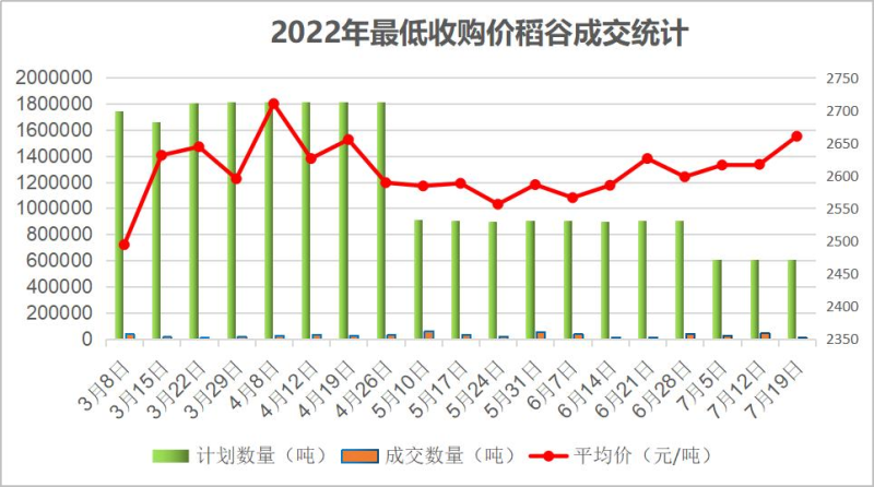 7月12日最低收购价稻谷共计投放60.8万吨,成交4.71万吨,成交率7.75%,较上期上升3.46%,成交均价2617元/吨。