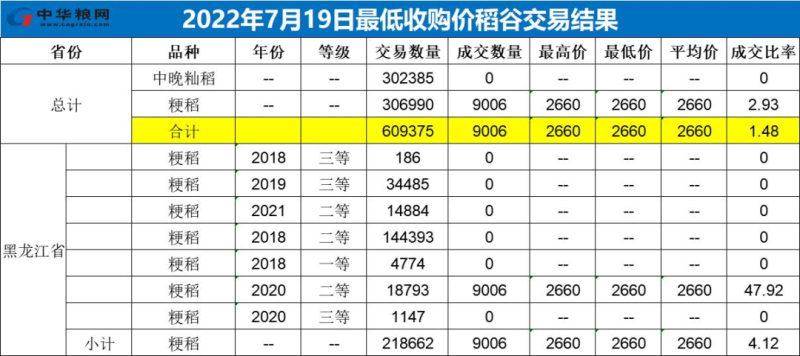 7月19日最低收购价稻谷共计投放60.94万吨,总成交只有9006吨,成交率为1.48%,降至年度最低;主要是黑龙江2020年粳稻成交为主,成交价格1.33。主要是受天气及下游需求影响,大米消费市场持续疲软。