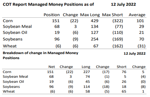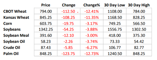 谷物和油籽市场最初反弹;然而,全球大宗商品价格持续下跌,导致农作物价格跌。美国高于预期的通胀数据引发衰退担忧, 只是增加了大宗商品价格压力。美国农业部的 WASDE 报告没有任何惊喜。