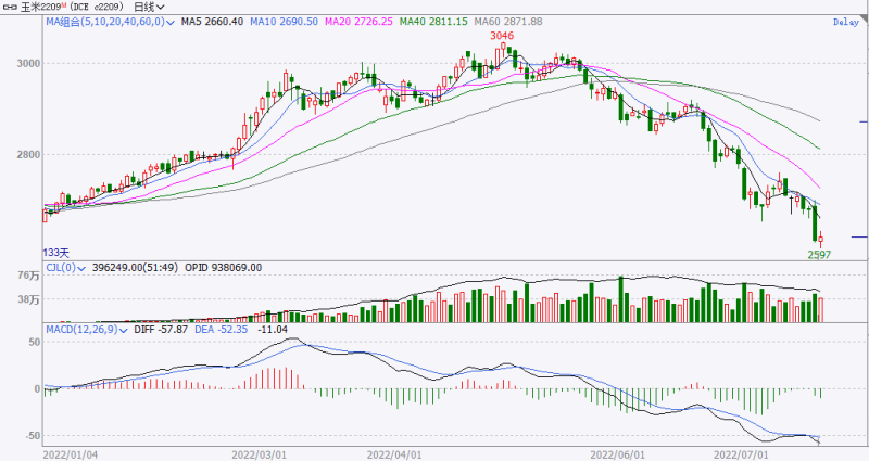 如今,时间仅仅过了一个月,国内玉米期现货价格就出现了联袂下滑,一度十分“炙手”的玉米成为了“烫手山竽”。7月20日,大连玉米期货主力2209合约盘中跌破2600元大关,触及9个月低点2597元,自今年6月20日至7月20日,23个交易日每吨累计下跌323元。