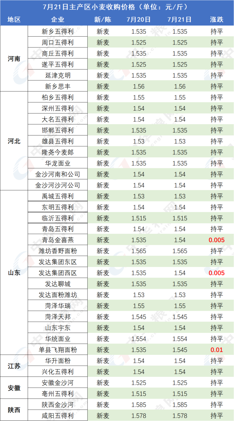 小麦短期上涨明显,后期等到小麦政策性储备轮换补库结束,需求回归到面粉加工为主的渠道上来,价格被动性可能更大,供需宽松的基本面下不要对行情过于乐观。7月21日成武利生集团涨一分,普麦1.55元/斤,其他地区新麦涨价消息请点开链接查看