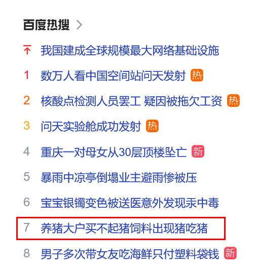7月24日,话题#养猪大户买不起猪饲料出现猪吃猪#登上热搜。