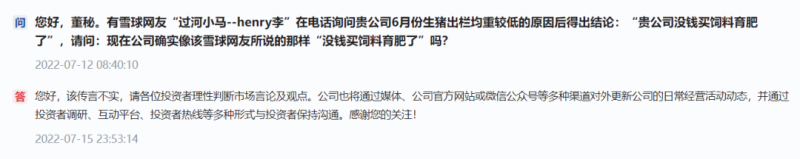 记者查询发现,7月15日,正邦集团曾在深圳证券交易所法定信息披露平台回应了“买不起”猪饲料的传闻,称传言不实。