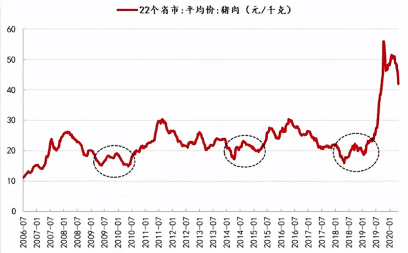 资料显示,在2019年雏鹰农牧暴雷后的7个月之后,国内猪肉价格出现暴涨,价格一路从20元30元40元,最高涨到50元。