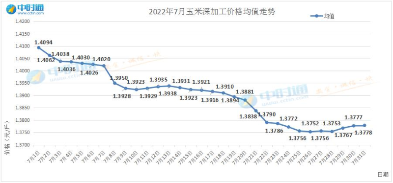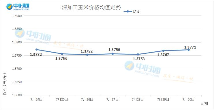 截止到7月31日,较上周相比,全国玉米均值由1.3786元,小幅度下跌至1.3771元,跌幅1.5厘;华北地区玉米均值由1.4136元,上涨至1.4166元,涨幅3厘;东北地区玉米均值由1.3292元,跌至1.3248元,跌幅4.4厘。