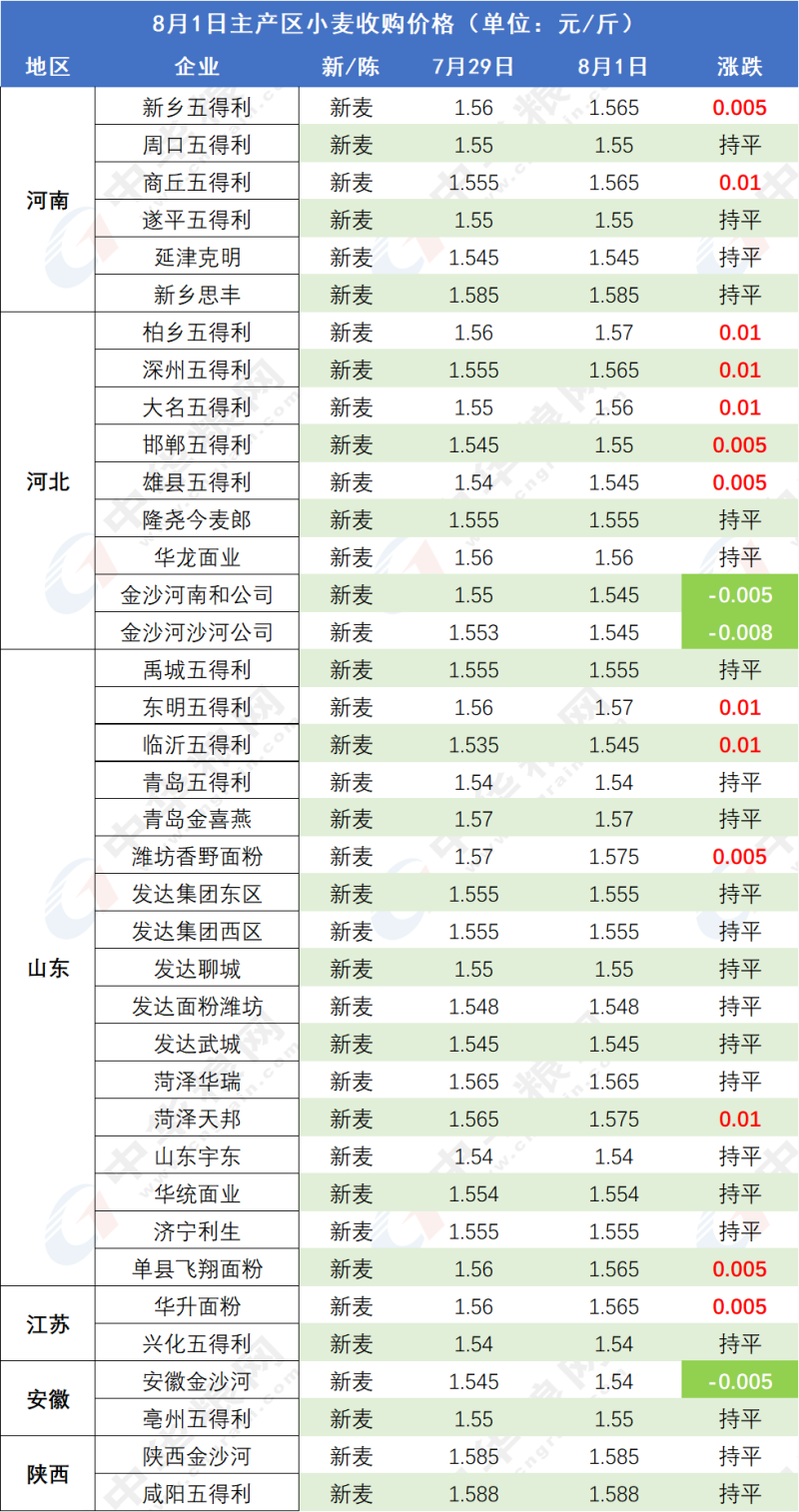 河北金沙河下调5厘,小麦价格1.54