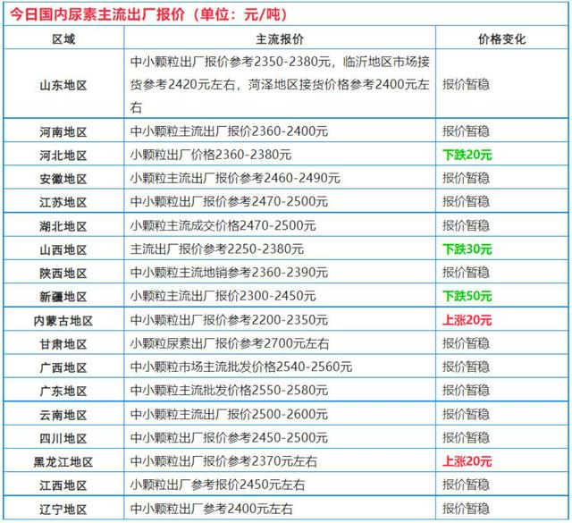 从8月4日公布的厂区价格来看,调整区域缩小,涨跌互现。其中,河北地区每吨下跌20元,出厂价格每吨在2360-2380元;山西地区每吨下跌30元,出厂价格每吨在2250-2380元;新疆地区每吨下跌50元,出厂价格每吨在2300-2450元;内蒙古地区每吨上涨20元,出厂价格每吨在2200-2350元;黑龙江地区每吨上涨20元,出厂价格每吨为2370元左右。其它地区价格稳定,价格与昨日持平,
