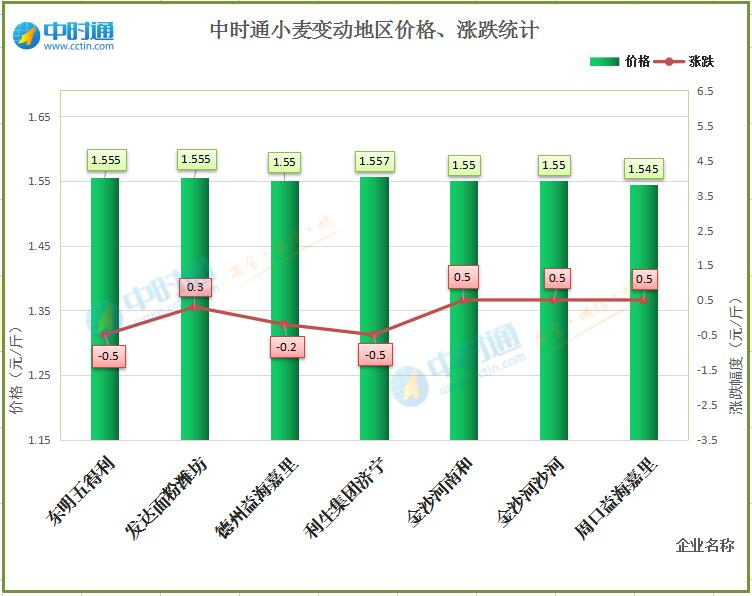 今日小麦价格涨跌互现,震荡幅度5厘左右,东明五得利小麦收购价格1.555元,较昨日落5厘,利生集团济宁小麦收购价格1.557元,较昨日落5厘,金沙河南和小麦收购价格1.55元,较昨日涨5厘,金沙河沙河小麦收购价格1.55元,较昨日涨5厘,周口益海嘉里小麦收购价格1.545元,较昨日涨5厘。据不完全统计,今日国内面企收购均价为1.5508元/斤,小幅度上调。