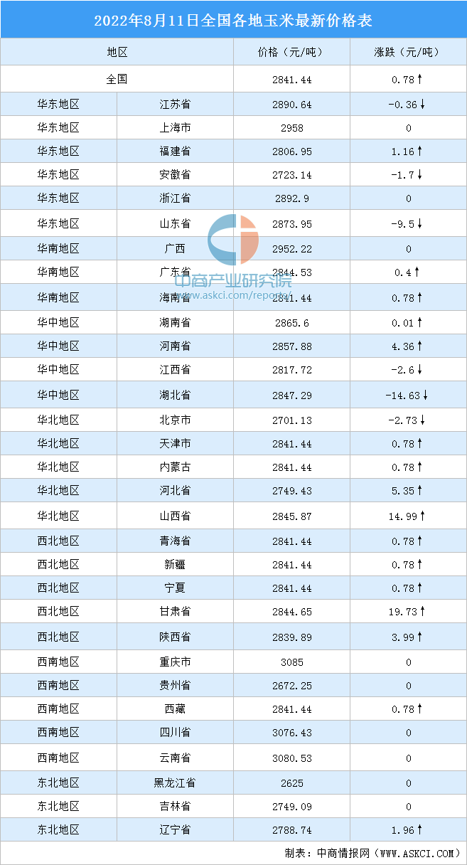 中商情报网讯:2022年8月11日全国玉米价格有所上涨,从地区上看有涨有跌。8月11日全国玉米均价为2841.44元/吨,环比每吨上涨0.78元。重庆市玉米均价最高为3085元/吨,环比持平。黑龙江省玉米均价最低为2625元/吨,环比与前一日持平。以下是2022年8月11日全国各地最新玉米价格趋势表:
