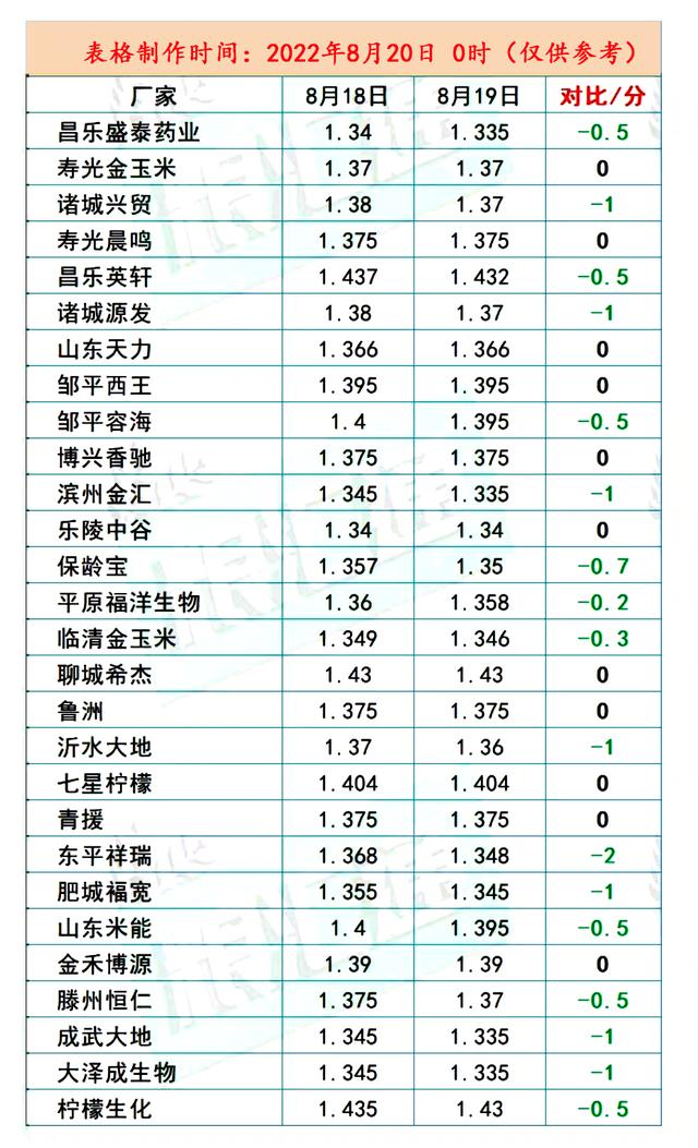 其中,孟州华兴以及汉永酒精报价下跌10元,执行价跌至1.38元/斤左右!而在山东市场,工厂报价普遍走跌,昌乐盛泰、诸城兴贸、昌乐英轩、诸城源发、滨州金汇、保龄宝、临清金玉米、东平祥瑞、沂水大地等,多达17家深加工企业报价下跌,跌幅普遍维持在10~40元/吨,东平祥瑞报价下跌40元,执行价1.348元/斤,山东部分工厂报价跌破了1.34元/斤!