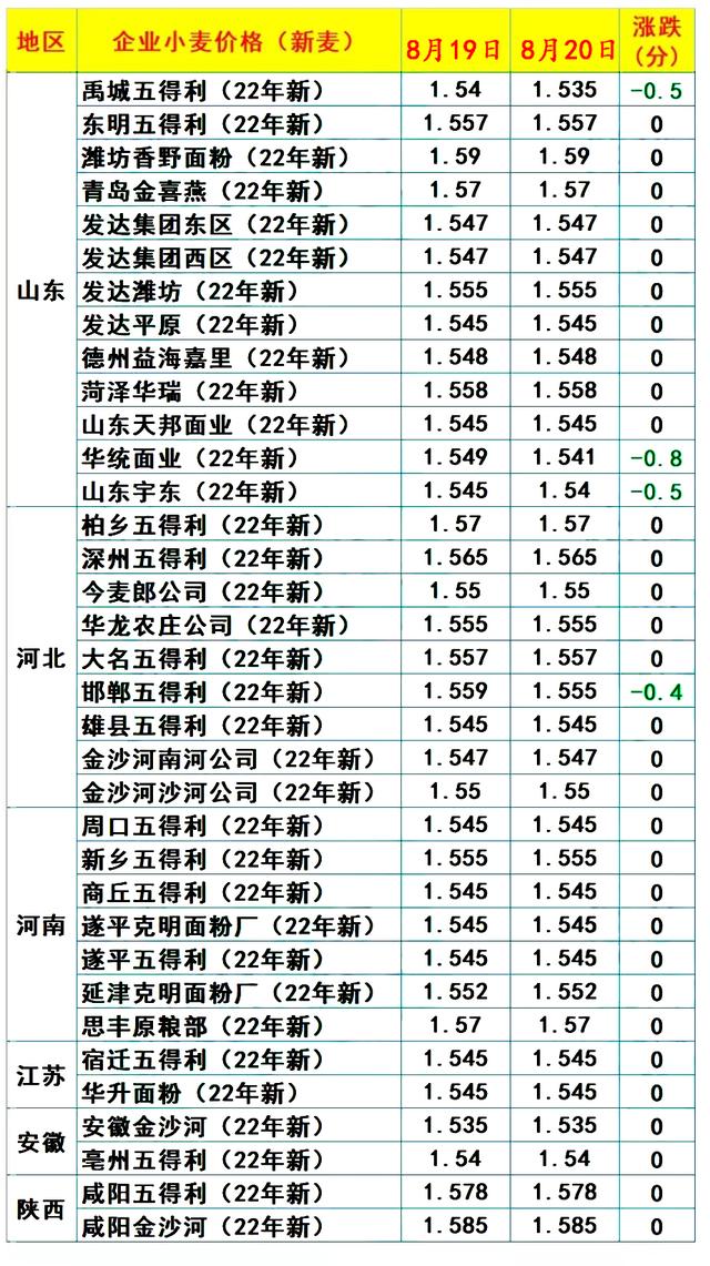 目前,山东、河北地区,零星地区,面粉厂报价下跌,其中,禹城五得利、宇东面粉、华统面业以及邯郸五得利,工厂小麦报价下跌8~16元/吨,主流面粉厂小麦价格徘徊在1.545~1.57元/斤左右!
