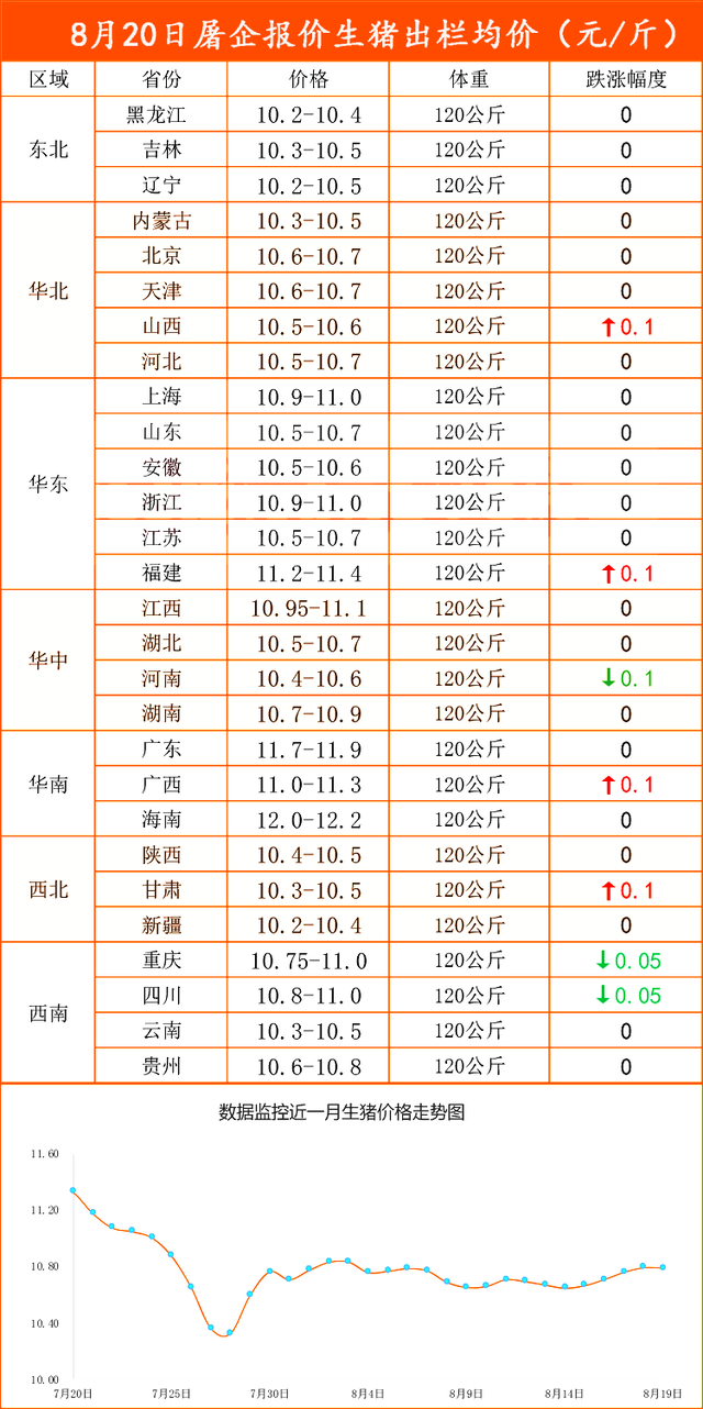 其中,在国内市场,低价地区,东北行情横盘10.2~10.5元/斤,高价地区,川渝市场震荡下跌,四川行情10.8~11元/斤。在华东以及华中地区,猪价普遍企稳,局地小幅调整,其中,山东企稳10.5~10.7元/斤,江浙市场10.5~11元/斤,而在华南地区,两广行情11~11.9元/斤!