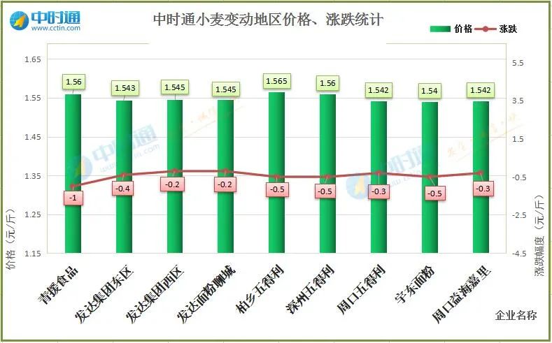 今日小麦价格继续小幅度下跌,跌幅2厘-1分不等,青援食品小麦收购价格1.56元,较昨日落1分,发达集团东区小麦收购价格1.543元,较昨日落4厘,发达面粉聊城及发达集团西区小麦收购价格1.545元,均较昨日落2厘,柏乡五得利小麦收购价格1.565元,较昨日落5厘,深州五得利小麦收购价格为1.56元,较昨日落5厘,周口五得利小麦收购价格1.542元,较昨日落3厘,宇东面粉小麦收购价格1.54元,较昨日落5厘,周口益海嘉里小麦收购价格1.542元,较昨日落3厘。据不完全统计,今日国内面企收购均价为1.5500元/斤,小幅度下滑。