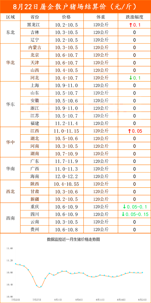其中,东北地区,猪价横盘10.2~10.5元/斤。在华北地区,猪价10.3~10.7元/斤;而在南方市场,川渝两地10.6~10.9元/斤,华东大部行情企稳10.5~11.4元/斤。华中地区,屠企报价10.3~11.15元/斤……