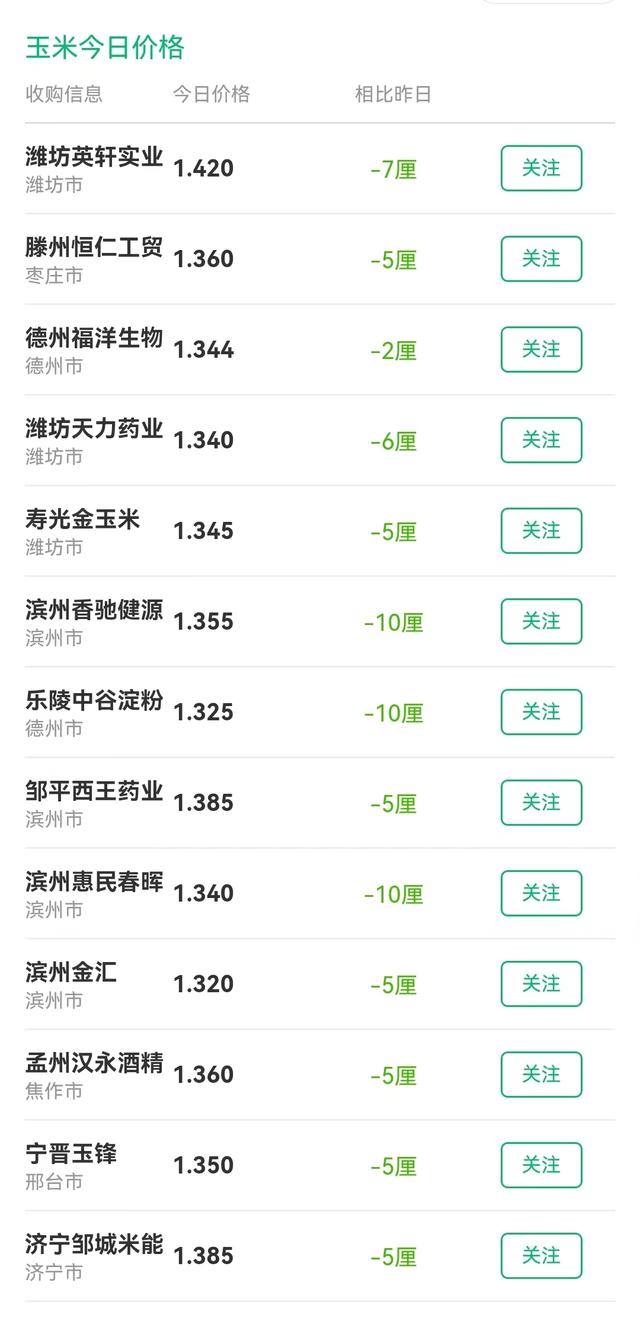 在山东地区,滨州香驰健源、乐陵中谷、惠民春晖、英轩实业、山东天力、枣庄恒仁、寿光金玉米以及邹平西王等,工厂落价10~20元/吨!山东地区,企业挂牌报价跌至1.32~1.435元/斤,滨州金汇以及大泽成生物报价触底1.32元/斤!